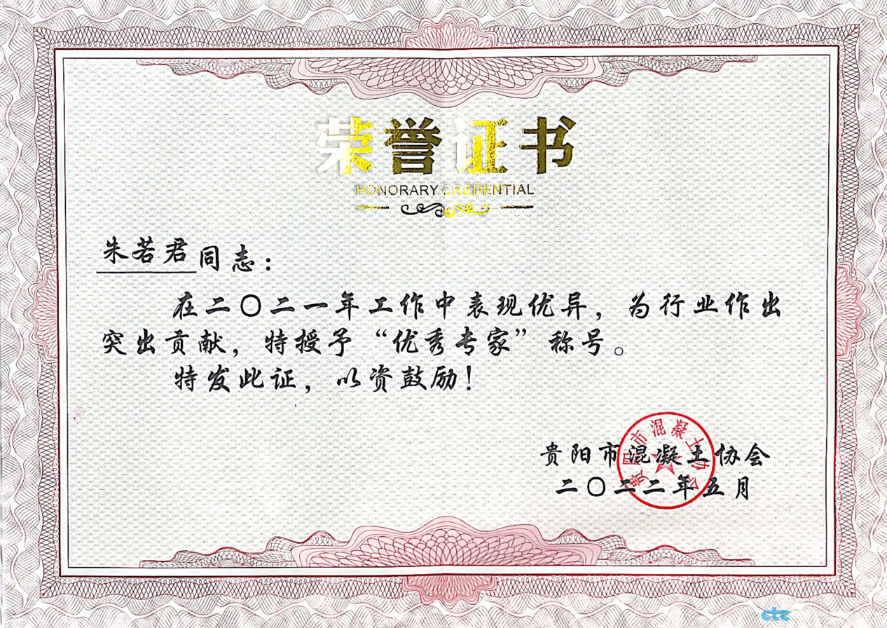 2022年5月30日下午,由貴陽(yáng)市混凝土協(xié)會(huì)召開(kāi)的貴陽(yáng)市預(yù)拌混凝土行業(yè)實(shí)驗(yàn)等級(jí)評(píng)定工作總結(jié)會(huì)上,我司員工朱若君、陶冠園在參與貴陽(yáng)市混凝土企業(yè)專項(xiàng)實(shí)驗(yàn)室等級(jí)評(píng)定工作中被貴陽(yáng)市混凝土協(xié)會(huì)授予“2021年度優(yōu)秀專家”榮譽(yù)稱號(hào)。