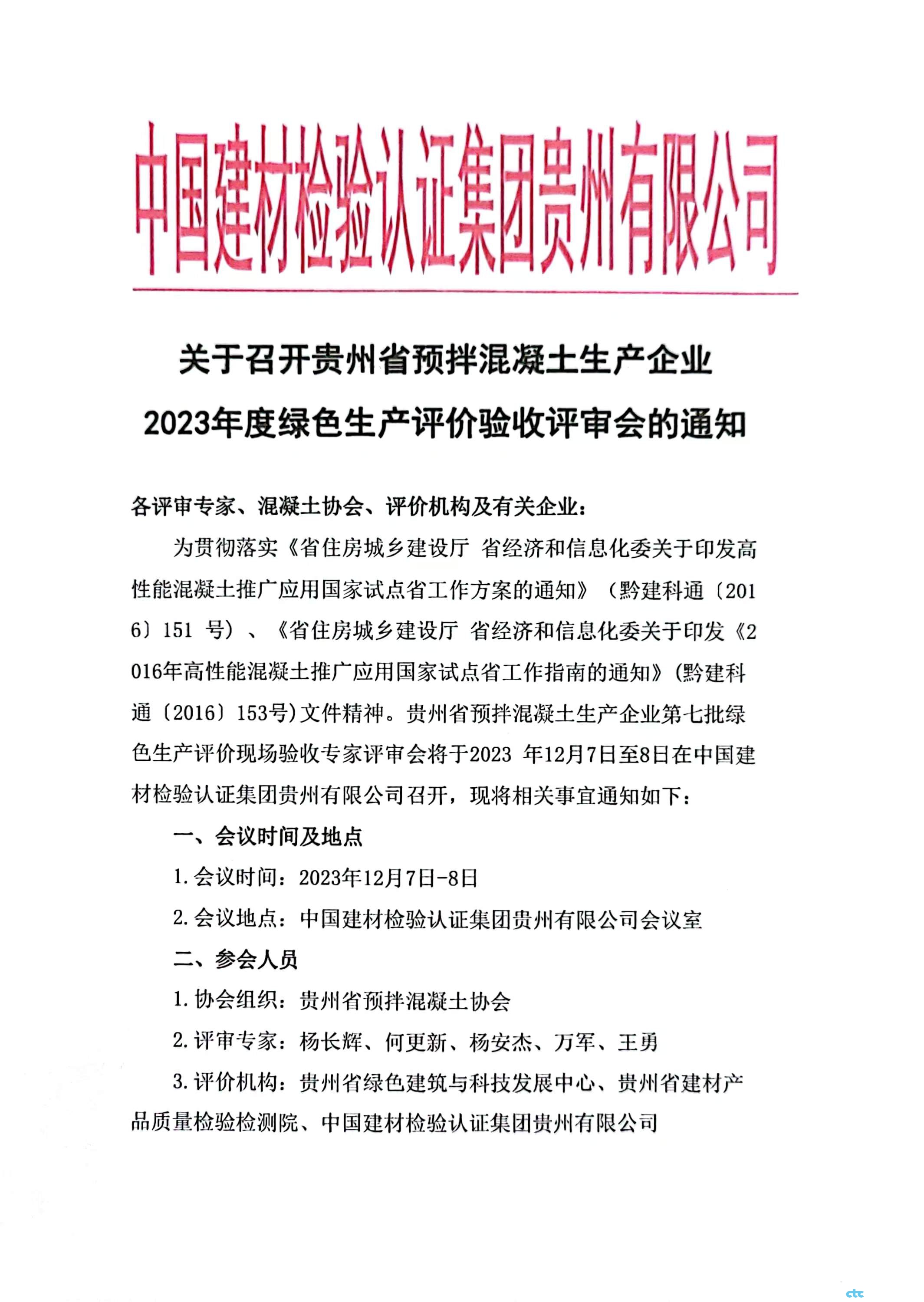 關(guān)于召開貴州省預(yù)拌混凝土生產(chǎn)企業(yè) 2023年度綠色生產(chǎn)評價驗收評審會的通知
