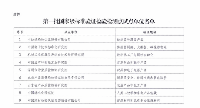為貫徹落實《國家標準化體系建設(shè)發(fā)展規(guī)劃(2016-2020年)》(國辦發(fā)〔2015〕89號)中關(guān)于加強標準驗證能力建設(shè)、建設(shè)國家級標準驗證點的相關(guān)要求,做好標準驗證點建設(shè)工作,進一步探索標準驗證點工作模式和機制,國家標準化管理委員會委于2017年7月17日下發(fā)了《國家標準委辦公室關(guān)于下達第一批國家級標準驗證檢驗檢測點試點的通知》(標委辦綜合〔2017〕122號),批準了第一批20家國家級標準驗證檢驗檢測點試點單位,覆蓋電子、皮革、紡織、化工等領(lǐng)域,國檢集團負責建筑材料和無機非金屬新材料領(lǐng)域的驗證試點工作,將為相關(guān)標準制修訂提供標準驗證服務(wù)。