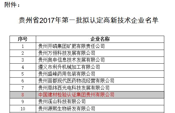 國檢集團貴州公司于2017年8月10日作為2017年度貴州省第一批高新技術(shù)企業(yè)予以公示。